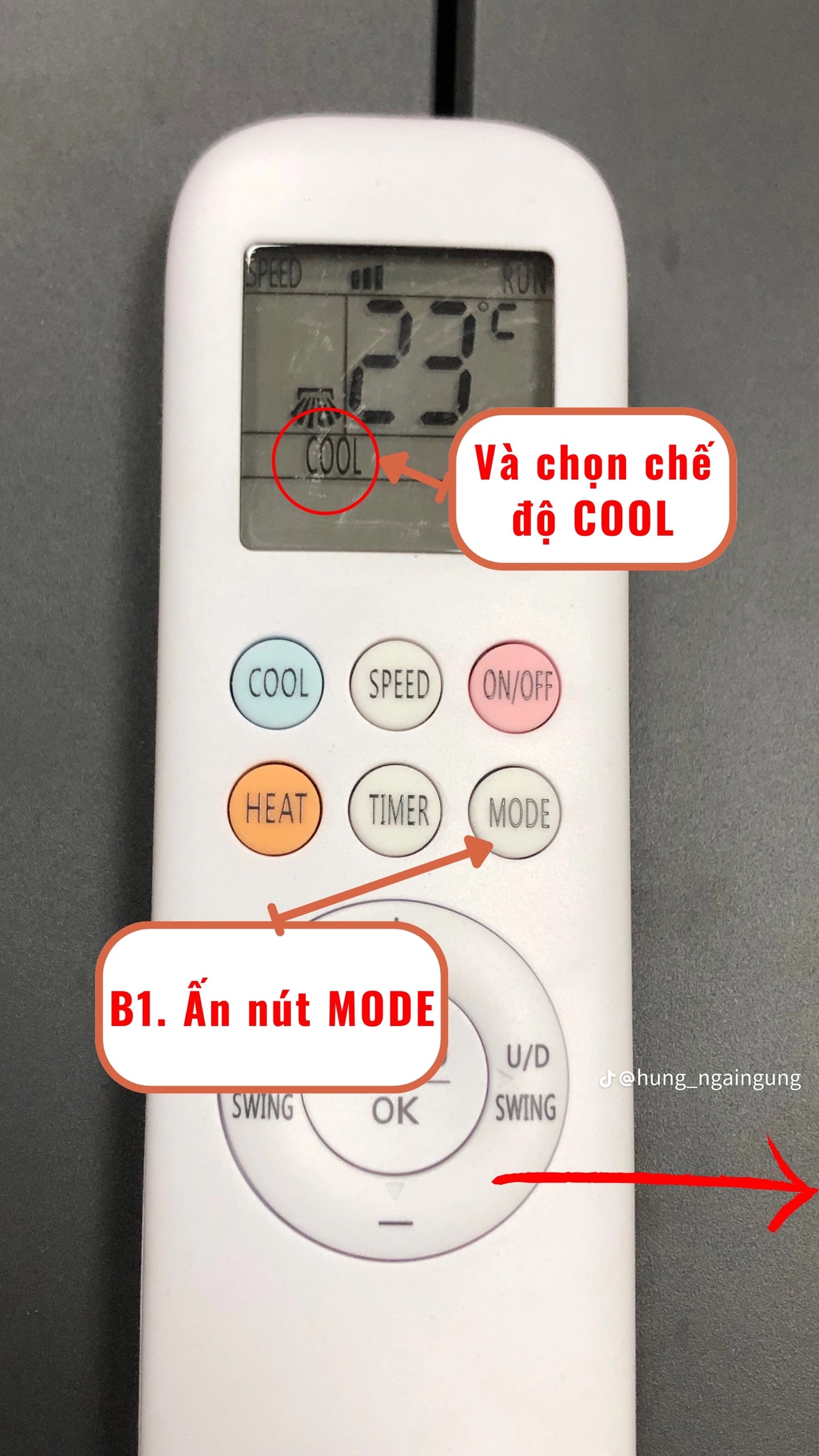 1. Nhấn nút Mode trên điều khiển điều hòa và chọn chế độ Cool (chế độ làm lạnh)