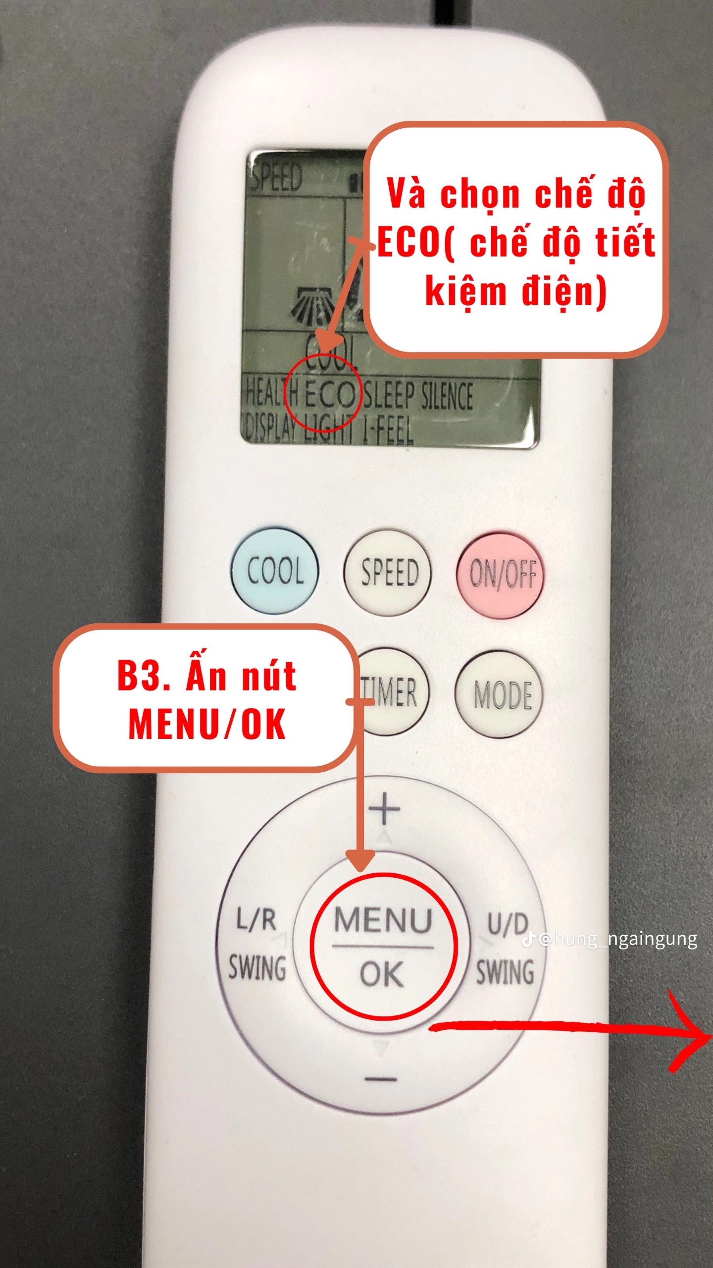 1. nhân nút MENU/OK khi nào màn hình điều khiển hiện chữ ECO như hình ảnh ở dưới là được.
