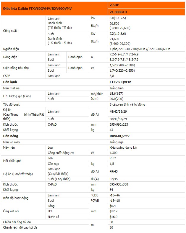 Máy lạnh Daikin Inverter 21000BTU FTXV60QVMV - Lựa chọn hoàn hảo với khả năng làm lạnh và sưởi ấm. Công suất 1 HP phù hợp cho phòng dưới 35 m². Tính năng hiện đại như vận hành tự động, luồng gió Coanda, mắt thần thông minh, công nghệ Inverter, và phin lọc Enzyme Blue mang lại trải nghiệm sử dụng tuyệt vời.